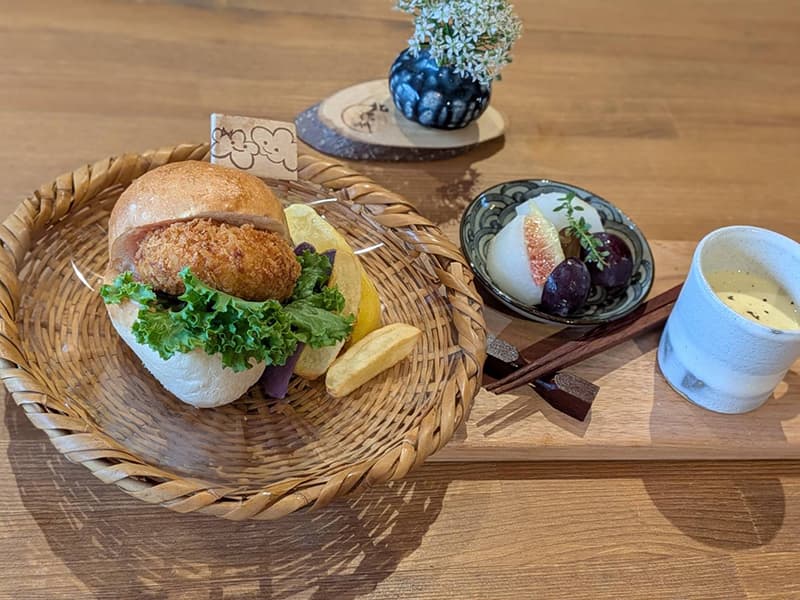 先日のメニューは、ポテコロッケハンバーガーと季節の果物、畑で採れたじゃが芋のフライドポテト(数種類)。